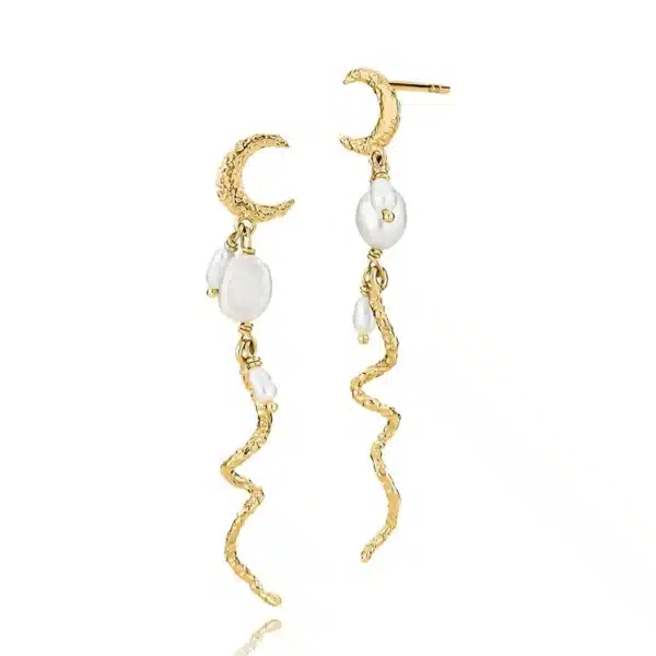 Fine øreringe i forgyldt sølv med ferskvandsperler fra Sistie, øreringene måler 45 mm i længden.